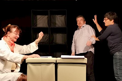 DarstellerInnen aus den Ensembles des Dreigroschentheaters und des THEATER machWERK lesen und spielen in wechselnden Rollen eine Auswahl aus der Revolutionstrilogie, die in derTradition des absurden Theaters steht, kongenial live begleitet von den Musikern Sylvia Fischer und Markus Fürnrohr.